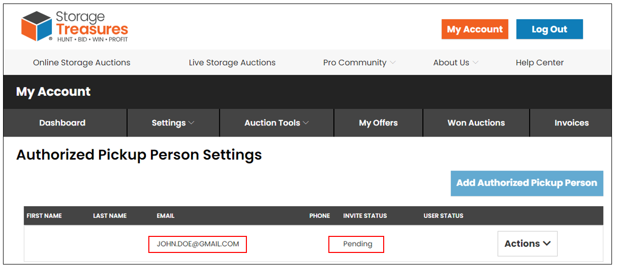 At this point, you can monitor the status of the invite in the Authorized Pickup Person Settings page. The invite status will be in Pending until the recipient of your invite will accept or decline the invitation request (depending on the decision the invite status will change to Accepted or Declined). You will also be able to review the Authorized Pickup Person eligibility; their StorageTreasures account needs to be in a good standing. Only Authorized Pickup Person recognize as eligible will be displayed in the invoice to be authorized to clean up the unit.