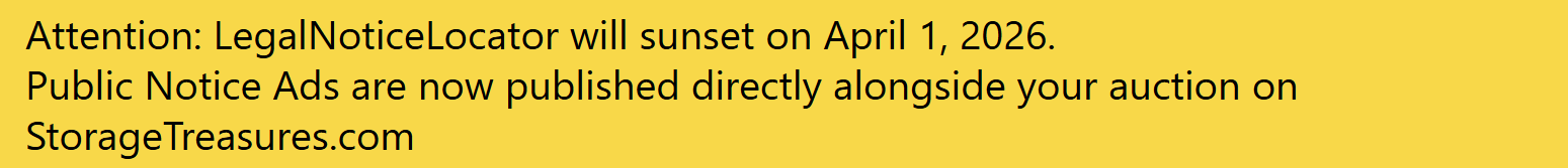 hosted by StorageTreasures. Legal Notice Locator was an online platform that enabled self-storage facility operators in select states to publish lien sale notices digitally rather than relying solely on traditional newspaper advertising. For operators in the 25 US states that permit online public notice advertising, Legal Notice Locator provided a simple, free way to meet statutory requirements and reach prospective buyers.